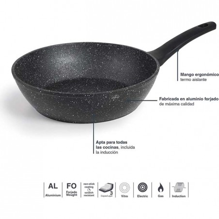 Padella profonda realizzata in alluminio forgiato di altissima qualità. Rivestimento antiaderente a TRI strati rinforzato con particelle a base di pietra, privo di materiali tossici e pesanti. Ecologico e privo di PFOA . Risparmio energetico, fino al 45% più efficiente, grazie alla base diffusore FULL INDUCTION. La base in alluminio consente una distribuzione uniforme del calore, consentendo una cottura rapida e uniforme degli alimenti, senza l'utilizzo di olio. Massima resistenza all'usura. Facile pulizia interna ed esterna grazie alla sua protezione antiaderente. Compatibilità: tutti i tipi di piani cottura, compresa l'induzione. Diametro superiore: 28 cm. Diametro inferiore: 22,2 cm. Altezza: 7 cm.
