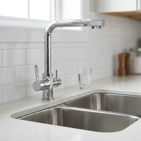 Rubinetto monocomando verticale per lavello con sistema ad osmosi , progettato per fornire acqua potabile filtrata e acqua calda/fredda da un unico punto di installazione.