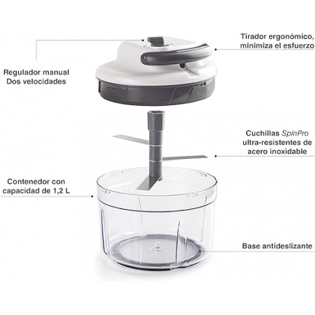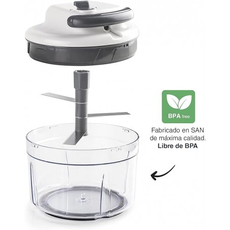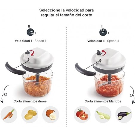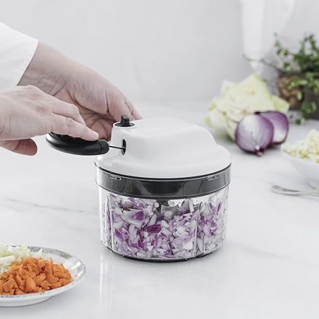 Tritatutto manuale AFFILATO in plastica di alta qualità che trita tutti i tipi di alimenti, tra cui verdure, frutta, noci, datteri, zenzero, aglio, cipolle, erbe aromatiche e altro ancora. Include tre potenti lame ultra resistenti in acciaio inossidabile di alta qualità. Regolazione a due velocità con interruttore di emergenza manuale. Bassa velocità (I): trita e sminuzza più grossolanamente ed è adatto per alimenti più duri come carote, patate o cipolle. Alta velocità (II): trita e sminuzza più finemente ed è adatto per alimenti più morbidi come pomodori o zucchine. Pratico e molto facile da usare: basta tirare la maniglia per attivare le lame. Taglia in modo preciso e uniforme. L'impugnatura è ergonomica e la base antiscivolo è sicura al 100%. Occupa poco spazio poiché l'impugnatura si ripiega sul coperchio del tritatutto. È piccolo, compatto e molto facile da pulire. Dimensioni: Diametro: 13 cm / Altezza: 14 cm / Capacità: 1,20 L.