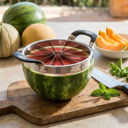In estate, meloni e angurie sono i protagonisti di molte tavole. E tagliarli non è sempre facile: coltelli inadatti, fette troppo spesse o troppo sottili, fette storte... Forse la presentazione non è così importante a casa (anche se vedere chi ottiene la fetta migliore è certamente un fattore), ma è fondamentale nei ristoranti quando si prepara un buon dessert o un antipasto di melone e prosciutto. Questo taglia melone e anguria produce 12 fette perfette con il minimo sforzo e in pochissimo tempo. Per utilizzarlo, tagliare entrambe le estremità del melone o dell'anguria e posizionarli su un tagliere. Posizionare l'affettatrice al centro del frutto e premere con entrambe le mani. L'affettatrice è realizzata in acciaio inossidabile, un materiale che garantisce un'eccellente resistenza alla corrosione, agli acidi e ai sali alimentari. È liscia, non porosa e molto igienica, facile da pulire (lavabile in lavastoviglie) e non conferisce sapori indesiderati agli alimenti. I manici sono realizzati in plastica ad alta resistenza. Questo taglia melone/anguria ha un diametro di 25 cm.