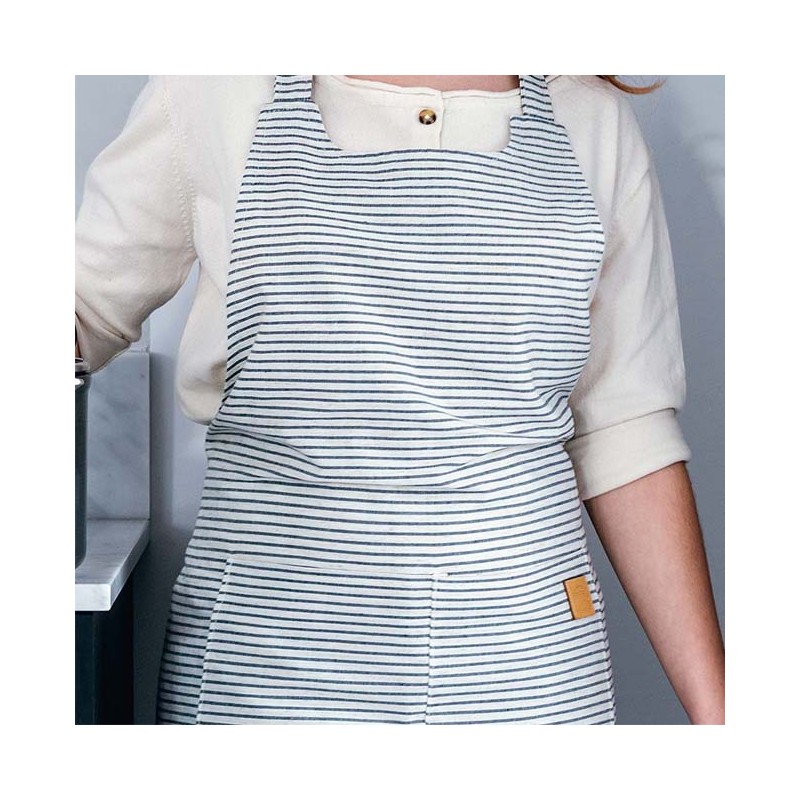 Il grembiule ha un design semplice, elegante ed originale, con righe bianche e blu.