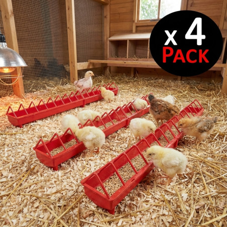 Mangiatoia a griglia larga per galline e polli. Misure: larghezza 102 cm, profondità 12 cm, altezza 12,5 cm. Prodotto in Spagna. Confezione da 4 unità.
