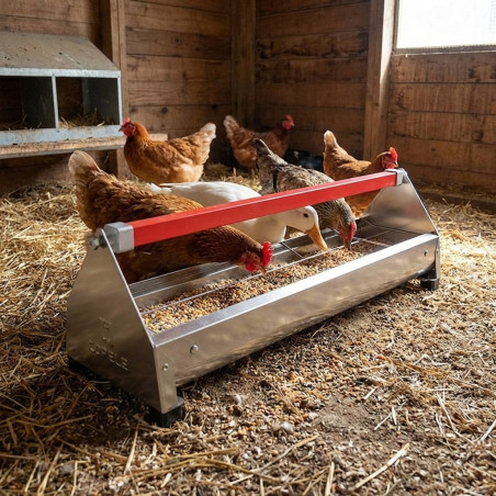 Mangiatoia da ingrasso ideale per polli e anatre, progettata per evitare sprechi di cibo avanzato e permetterne la miscelazione con qualsiasi integratore o miscela di cereali. Le sue finiture curve lo rendono molto facile da pulire e include gambe che impediscono il deterioramento dovuto all'umidità sul pavimento.