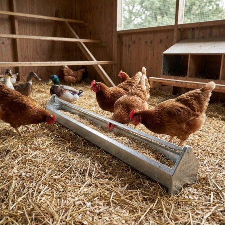Mangiatoia da ingrasso ideale per polli e anatre, progettata per evitare sprechi di cibo avanzato e permetterne la miscelazione con qualsiasi integratore o miscela di cereali. Le sue finiture curve lo rendono molto facile da pulire e include gambe che impediscono il deterioramento dovuto all'umidità sul pavimento.