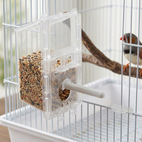 Mangiatoia anti-spreco in PVC trasparente di alta qualità con capacità di 250 g. Si adatta a tutti i tipi di gabbie che utilizzano mangiatoie a linguetta singola. È composta da due parti: una che si fissa alla gabbia e l'altra, un serbatoio che può essere facilmente agganciato e rimosso tramite guide. La mangiatoia si riempie sollevando il coperchio situato sulla parte superiore.