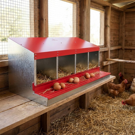 Questo modello specifico è dotato di quattro scomparti individuali , che offrono ampio spazio a ogni gallina per trovare il proprio angolo privato. È consigliato per ospitare comodamente da 12 a 16 galline , garantendo a ciascuna lo spazio necessario per deporre le uova senza stress o competizione. Le sue dimensioni complessive di 106 x 49 x 44 cm (lunghezza x larghezza x altezza) offrono un'ottima capacità senza occupare troppo spazio nel pollaio.