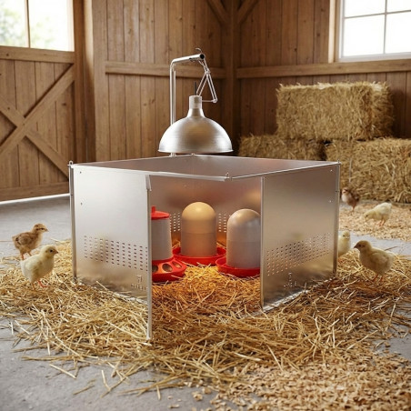 Parco di allevamento per l'allevamento dei pulcini. Un parco pensato per i primi giorni dei pulcini, fornendo all'animale uno spazio sicuro e confortevole dove crescere. Il modello accessoriato comprende: mangiatoia e abbeveratoio di prima età e kit posatoio e schermo con lampada a infrarossi, per fornire ai pulcini un sano riscaldamento quando richiesto, e mangiatoia e abbeveratoio di prima età. Realizzato in metallo zincato, è un prodotto duro e resistente. Grazie al suo materiale di alta qualità, permette al calore di essere distribuito uniformemente in tutta la covata.