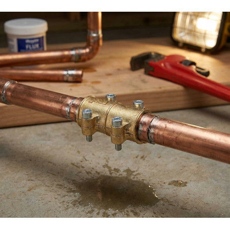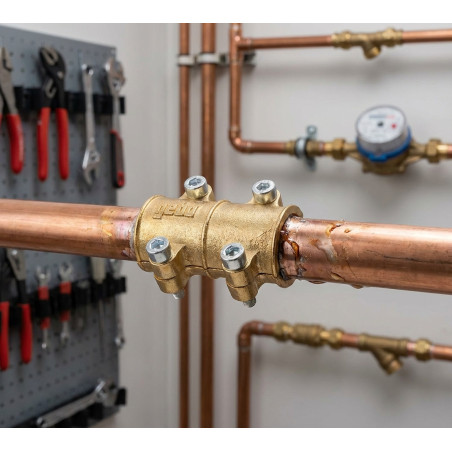 Fascetta in ottone utilizzata per tappare i fori nei tubi di rame. Gomma interna che impedisce il passaggio dell'acqua verso l'esterno. Misura 22 mm. Consigliato per tubi da 22mm. Consigliato per sigillare buchi, crepe e punti porosi.