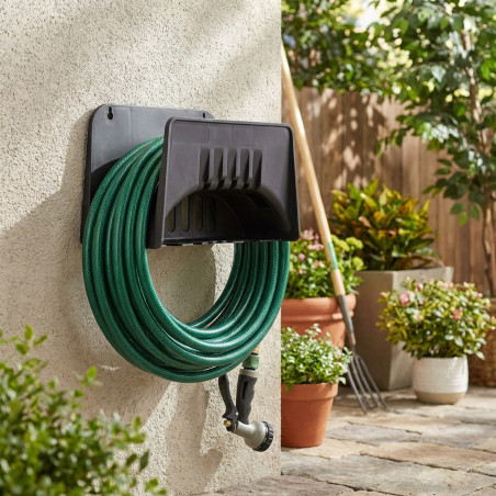 Il supporto in plastica per tubi di irrigazione si adatta a tutti i tubi in commercio. Consente di posizionare il tubo da giardino sul muro utilizzando il gancio a muro. Con dimensioni di larghezza 24 cm, altezza 15 cm, profondità 15 cm, questo supporto ha capacità per tubi da 15 mm (fino a 25 metri) e 19 mm (fino a 20 metri). Inoltre, ha la massima qualità.