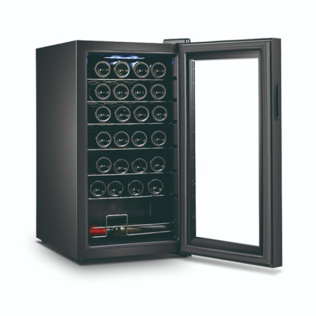 Il design moderno e funzionale di questa cantinetta per vini la rende un'elegante aggiunta a qualsiasi cucina, soggiorno o cantina. La sua porta in vetro permette di ammirare la collezione senza aprirla, preservandone le condizioni interne. È dotata di una luce LED interna che illumina delicatamente le bottiglie, mettendo in risalto le etichette e il colore del vino: ideale per le degustazioni o semplicemente per esporle.