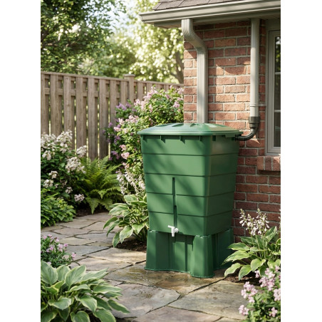 Serbatoio acqua in polipropilene 300 L Graf. Recuperatore acqua 66x80,92 cm, con base 67x53x33 cm, verde è la soluzione più semplice e conveniente per utilizzare l'acqua piovana. Realizzata in polipropilene, questa vasca è completa di coperchio e rubinetto di scarico, compresa di base per facilitare l'estrazione dell'acqua.