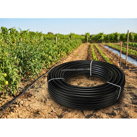 Tubo da 20 mm utilizzato negli impianti di irrigazione. Il tubo in polietilene agricolo è un tubo di qualità ecologica, fabbricato con prodotti riciclati ma con un sistema di fabbricazione di alta qualità che garantisce resistenza e durata nel vostro sistema di irrigazione. Non presenta fori, è completamente liscio con uno spessore di 1,7 mm. Pressione massima supportata 4 bar. Lunghezza 25 metri. Tubo di irrigazione prodotto in Spagna. Prodotto secondo la norma UNE 53367, qualità PE32.