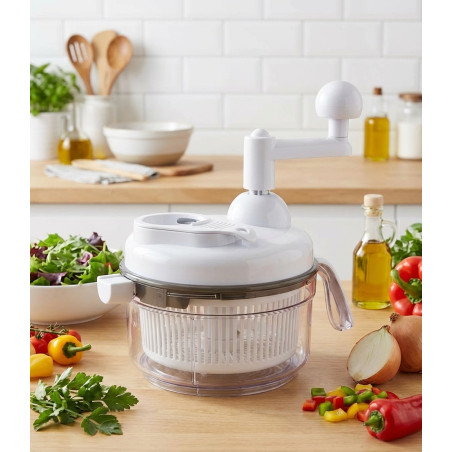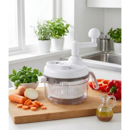 Tritatutto manuale in plastica di alta qualità e lame in acciaio inox. Multifunzionale, con cestello centrifuga per insalate, lama in acciaio inox per tritare verdure ed erbe aromatiche e frullatore per condire. Capacità 1 litro. Dimensioni: ø17x18.
