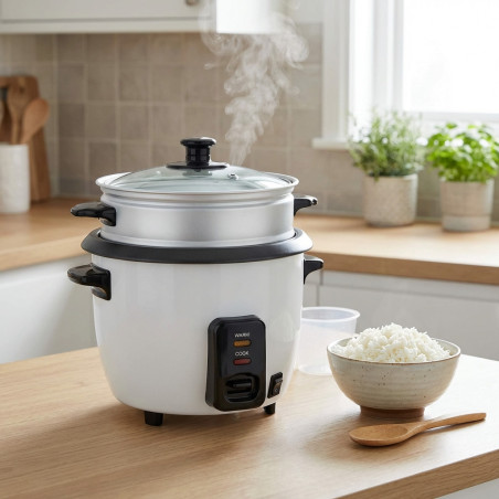 Pratica cuociriso elettrica per cucinare due o tre porzioni con una capacità di 0,6 litri.