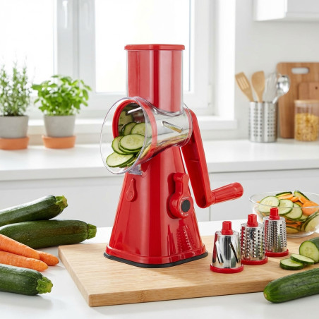 Grattugia/taglierina con meccanismo a manovella facile da usare. È dotata di 3 lame intercambiabili in acciaio inox per un taglio rapido ed efficiente delle verdure. La base antiscivolo garantisce stabilità durante l'uso, mentre le parti rimovibili ne facilitano la pulizia.