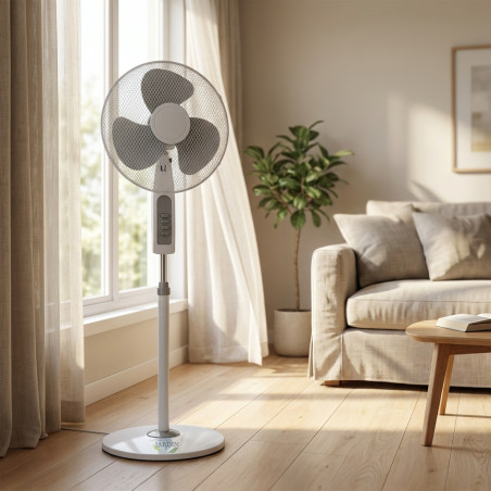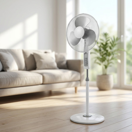 Perfetto per le giornate calde, questo superbo ventilatore a piantana da 16 pollici è facile da usare e montare. È dotato di griglia protettiva, una base circolare stabile e altezza regolabile. Oscilla di 120 gradi e ha tre velocità. Potenza: 45 W.