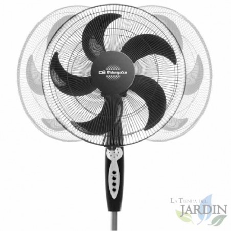 Ventilatore da terra con 60 W di potenza. Testa oscillante multiregolabile per distribuire l'aria in tutta la stanza. 3 velocità di ventilazione per scegliere quella che si adatta ad ogni situazione. Telecomando e timer fino a 6 ore. 5 lame da 40 cm di diametro e altezza regolabile fino a 128 cm.