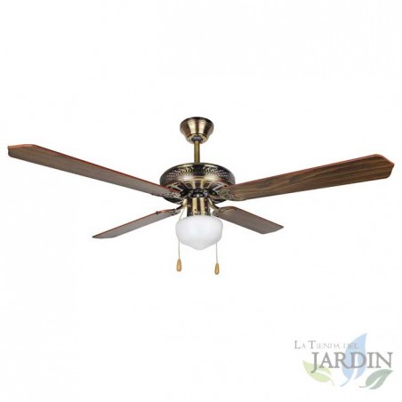 Diametro: 132 cm. Colore oro antico. 4 lame reversibili. 3 velocità di ventilazione. Sistema di ventilazione reversibile: modalità invernale ed estiva. Plafoniera tipo E27, 1 x 60 W (non inclusa). Potenza: 60 W. Altezza: 54 cm.