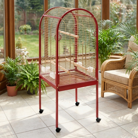 Gabbia per pappagalli, dotata di mangiatoie, abbeveratoi e bastoncini. Vassoio inferiore e griglia removibili, porta superiore e ruote con freno. Di forma curva.