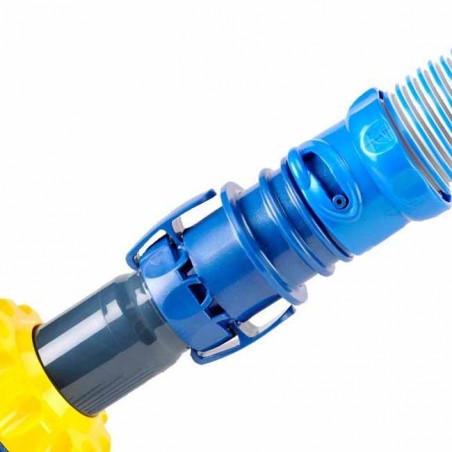 Disco con aletas que aumenta la movilidad del limpiafondos. Diafragma Dia Cyclone: aspiración aún más potente ( 40%). Mangueras Twist Lock: conexión segura sin pérdida de aspiración. Disco deflector anti-bloqueo para evitar escaleras, ángulos, etc. Longitud de la manguera: 10 secciones de 1 m. Funcionamiento: circuito de filtración de la piscina. Cobertura de limpieza: 30 cm. Potencia mínima requerida de la bomba de filtración: ½ CV. Cobertura de limpieza: 30 cm. Velocidad de desplazamiento: 6,5 m/min. Instalación: por el usuario en la toma de limpiafondos o en el skimmer. Fuente de energía: equipo de filtración de la piscina. Tecnología hidráulica por aspiración. Sistema de funcionamiento: Dia Cyclone. Ciclo de limpieza: se recomienda una filtración de 6 horas en 3 ciclos de 2 horas. Desplazamiento: aleatorio. Tipo de residuos aspirados: finos y medianos.
