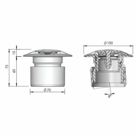 Boquilla de fondo oscilante para piscinas de hormigón. Permite realizar ajustes de hasta 8º, facilitando la instalación de la boquilla. Cuerpo oscilante en PVC. Tapa en ABS. Tornillo regulador en POM. Caudal máximo: 10 m³/h. Adaptable a tubo de Ø 75 mm y a pasamuros.