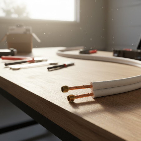 Rolo de tubo para instalação de ar condicionado. 3 metros de tubo duplo de 1/4" e 3/8", com porcas e alargadores, pronto para montar. Composto por dois tubos, um de 1/4" e outro de 3/8", revestidos com isolante branco, com alargadores nas extremidades e montados com porcas. Comprimento do rolo: 3 metros. O tubo está pronto para instalação; não são necessárias ferramentas especiais para a instalação (exceto uma chave inglesa ou chave de boca). Observação: a instalação do ar condicionado não é um processo simples e deve ser realizada por alguém com conhecimento no assunto.