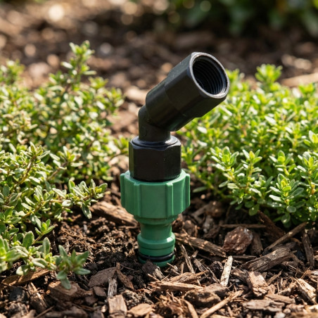 Cotovelo giratório de plástico de 3/4" para válvulas de liberação rápida. Este cotovelo giratório é usado com válvulas de liberação rápida e evita que a mangueira dobre enquanto a válvula está sendo girada. Feito de plástico altamente resistente a raios UV e impactos. A válvula e a válvula de hidrante estão disponíveis separadamente (consulte os produtos relacionados).