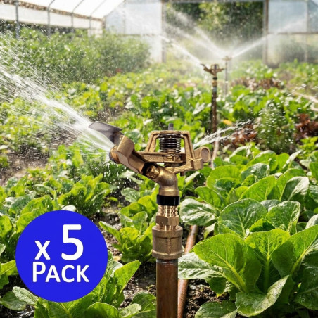 Aspersor de impacto aéreo de 1/2" para jardinagem, horticultura, floricultura e estufas, com alcance de 9 a 14 m e ângulo de irrigação circular de 360°.
