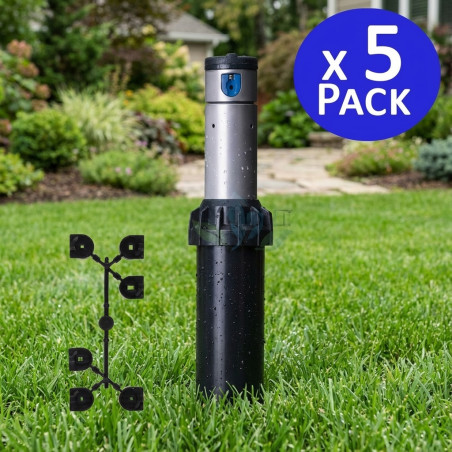 5 aspersores de 3/4" com retorno automático do arco, alcance de 5,2 a 14,3 m e ângulo de irrigação ajustável.