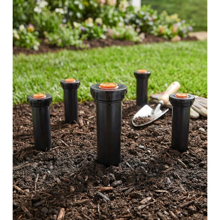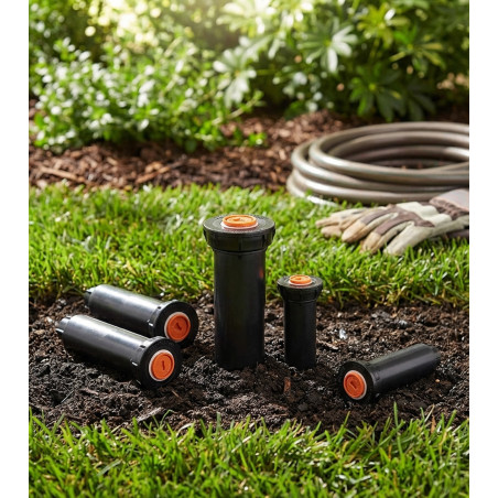 Pacote com 10 difusores de irrigação SEM bico. Rosca fêmea de 1/2". Altura de abertura: 5 cm. Altura do corpo: 10 cm. Pressão de operação: 1 a 2,1 bar. A pequena tampa torna o difusor invisível após a instalação.