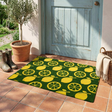 Dê as boas-vindas aos seus convidados com estilo e funcionalidade com o nosso capacho de limão de 75x45cm. Ele retém eficazmente a sujidade e a humidade, e possui uma base antiderrapante para maior segurança. O seu design vibrante e o material durável e reciclável tornam-no a escolha perfeita para uma entrada limpa e sustentável.