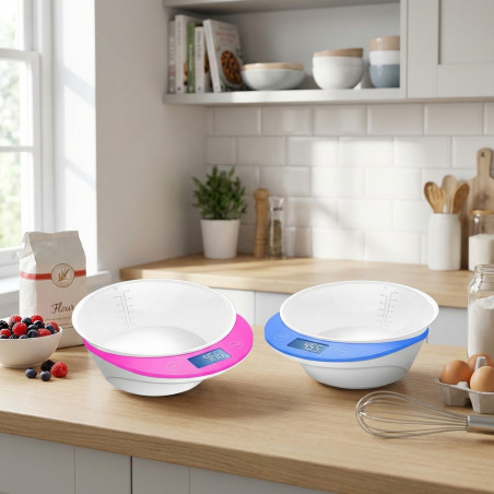Ideal para entusiastas da culinária, esta balança está equipada com quatro sensores de alta precisão. Tem capacidade para até 5 kg. A tigela tem capacidade para 0,95 L. O visor LCD mede 48 x 20 mm e possui retroiluminação. Mede em gramas, litros, onças e libras. As funções incluem tara, zeragem automática e desligamento automático. Também possui indicadores de sobrecarga e bateria fraca. Funciona com duas pilhas CR2032 (incluídas). Fornecida em duas cores aleatórias: rosa e azul, dependendo da disponibilidade. Apenas uma tigela está incluída.