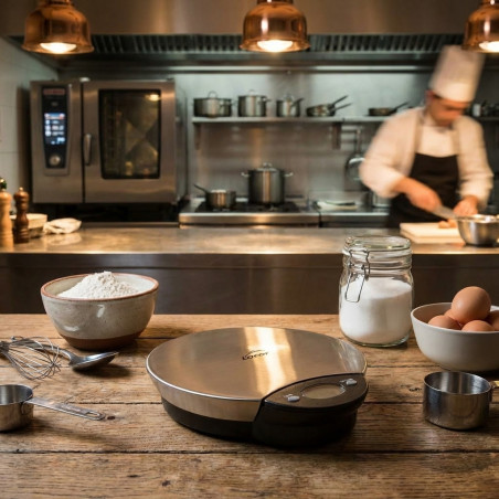 Balança de cozinha digital profissional de 5 kg com base em aço inoxidável. Oferece máxima precisão para o preparo de bolos e o controle de peso em dietas, com função tara e base antiderrapante. Compacta (15,5 x 12 cm) e muito fácil de limpar.