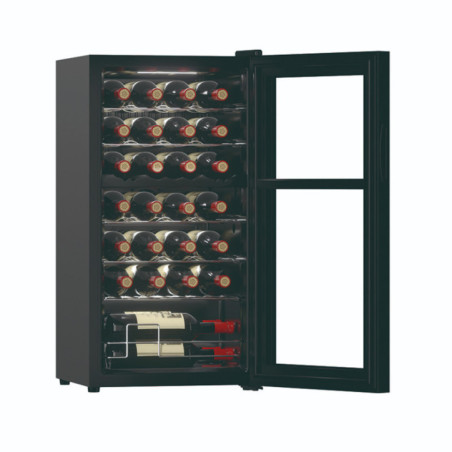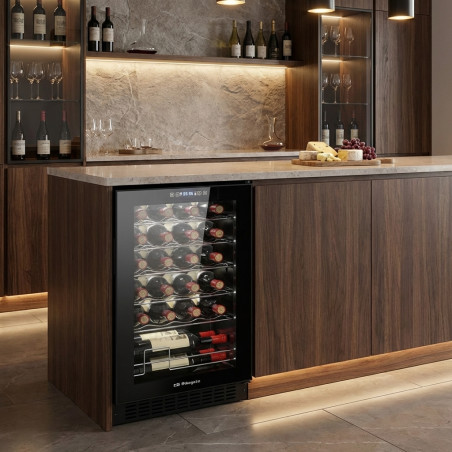Adega climatizada premium com compressor e capacidade para 28 garrafas. Garante a conservação perfeita graças ao seu sistema de refrigeração estável e controle digital preciso. Design elegante com iluminação LED e prateleiras cromadas.