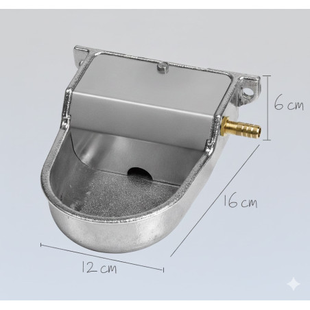 Bebedouro pequeno para cães com saída vertical. Totalmente automático, mantém o nível de água constante enquanto opera em baixa pressão. Feito de alumínio de alta qualidade. Projetado para ser fixado na parede. Dimensões: 12 x 16 x 6 cm.