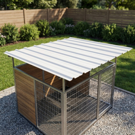 Telhado em chapa galvanizada de alta resistência para proteção solar. Combina perfeitamente com qualquer combinação ou design de canil. Também adequado para jardins e estacionamentos. Disponível nos tamanhos 150x200 e 200x250 cm. Fácil de montar.