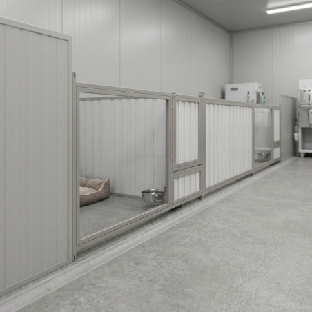 Frente para canil (200x100 cm) com porta, fabricada em painel sanduíche de 30 mm para máximo isolamento térmico e alta higiene. Ideal para garantir um espaço seguro e confortável.