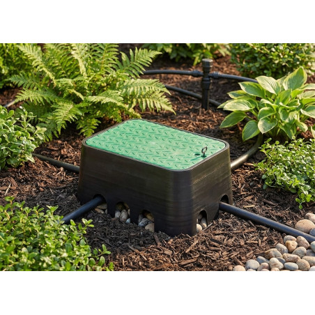 A caixa de válvulas para irrigação de jardim, com dimensões de 640x530x300 mm, é uma solução robusta, prática e durável, projetada para sistemas de irrigação enterrados, sistemas de irrigação automática e instalações profissionais ou domésticas. Esta caixa de válvulas retangular é fabricada com materiais resistentes às intempéries, perfeita para proteger componentes essenciais como válvulas solenoides, conexões, filtros e ramificações de tubulação. Seu design compacto permite uma instalação fácil e segura, mesmo em jardins pequenos, áreas verdes ou espaços com paisagismo extenso.