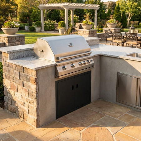 A estética minimalista e contemporânea desta porta preta a torna o complemento perfeito para qualquer projeto de cozinha externa, do rústico ao moderno. O acabamento em tinta resistente ao calor não só realça sua beleza, como também protege o aço, garantindo que sua churrasqueira mantenha uma aparência impecável ano após ano. Esqueça soluções temporárias; esta porta foi feita para durar.