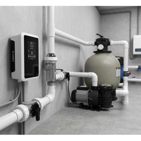 Clorador de sal Domótico D-42 S2: Desinfecção ecológica e prática para piscinas de até 120 m³. Produz 40 g/h de cloro por eletrólise de sal, eliminando a necessidade de produtos químicos agressivos para uma água cristalina e macia.