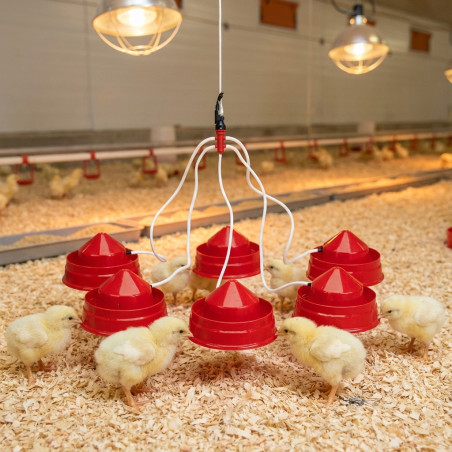 Bebedouro suspenso de nível constante para pintinhos. Dimensões da base: 15 x 15 x 9 cm. Fabricado na Espanha.