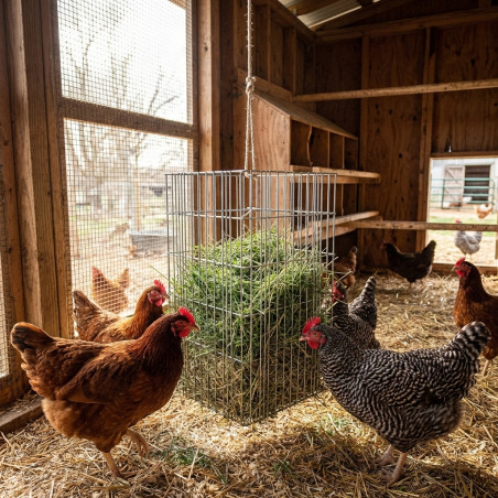 Comedouro suspenso projetado especificamente para aves. Fabricado em chapa galvanizada, resistente às intempéries. Um excelente sistema para reduzir o estresse animal, entretendo-os enquanto se alimentam. É um complemento ideal para sistemas de criação alternativos, oferecendo opções alternativas de alimentação e protegendo os animais da sujeira e de visitantes indesejados.