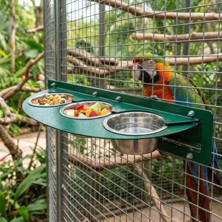 Comedouro giratório ideal para papagaios, com 3 recipientes em aço inoxidável, fabricado na Espanha. Fácil de manusear e limpar pelo lado de fora da gaiola. Dimensões: 54 x 21 x 10,5 cm.
