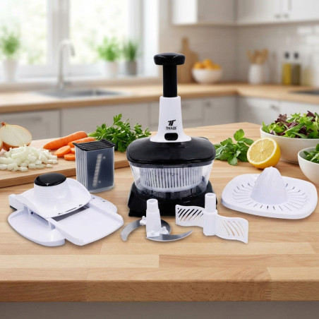 Pica, fatia, extrai sucos, mistura e escorre. Operação manual, sem necessidade de fios ou tomadas. Economiza energia. Inclui 15 peças intercambiáveis. Tigela resistente de 1500 ml. Lâmina de corte tripla em aço inoxidável. Mandolina com 5 lâminas de corte em aço inoxidável: fatiador, fatiador ondulado, ralador fino, ralador grosso e cortador julienne duplo. Cabo de precisão com trava. Base com ventosa antiderrapante.