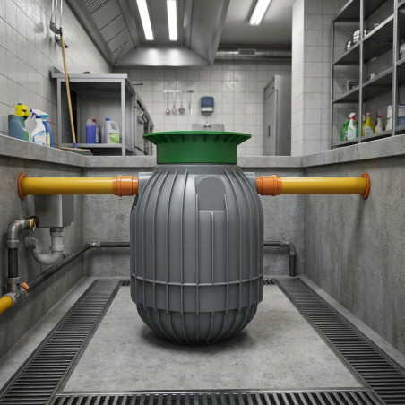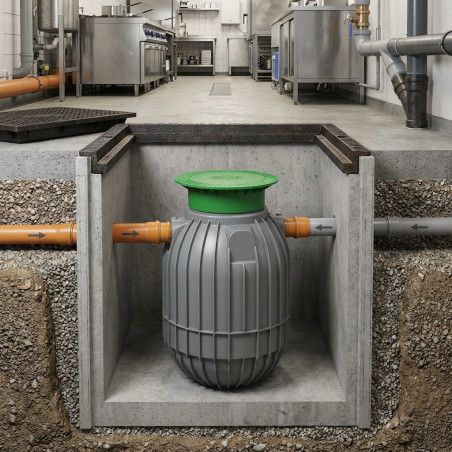 Instalação fácil e manutenção mínima: Seu design esférico permite uma instalação rápida e estável sob o piso. A manutenção se limita ao esvaziamento periódico quando o nível de gordura recomendado é atingido.