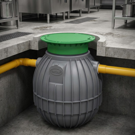 O separador de gordura SAPHIR 1200 L é a solução perfeita para empresas que geram águas residuais contendo óleos e gorduras. Fabricado pela GRAF , líder europeia em tratamento de água, garante a conformidade legal e protege o seu sistema sanitário. Seu design compacto, esférico e leve facilita a instalação subterrânea, evitando vazamentos e sobrecargas.