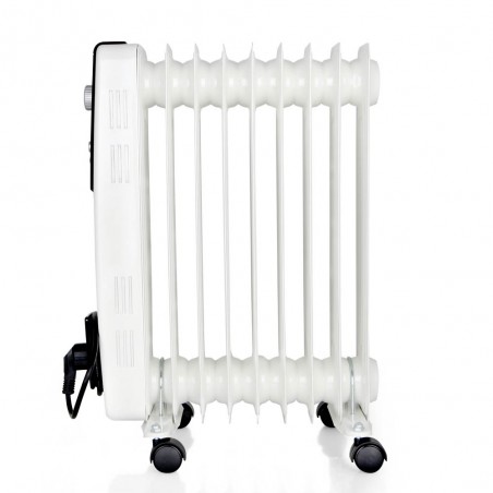 Radiador a óleo com 9 elementos de aquecimento e alta inércia térmica. Construção modular. 3 níveis de potência: 800, 1200, 2000 W. Termostato ajustável. Fusível térmico de segurança com limitador. Luzes de operação em LED. Rodas giratórias multidirecionais. Fácil manuseio. Alça de transporte. Com compartimento para cabos. Dimensões (L x A x C): 28 x 55 x 39,5 cm. Conexão: 230 V ~ 50 Hz.