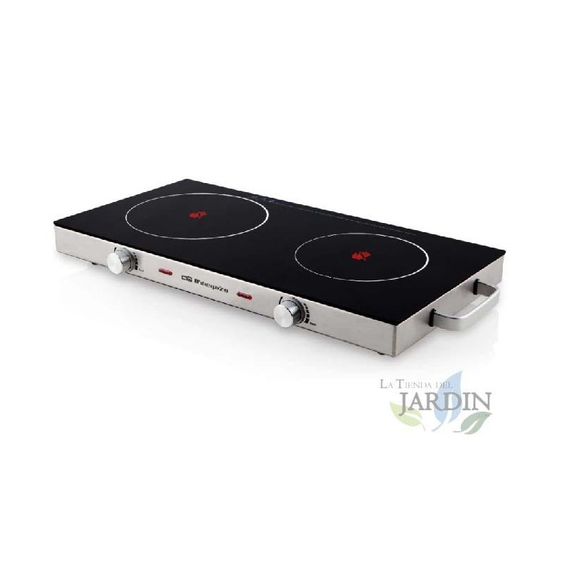 Fogão duplo de cerâmica Orbegozo com dois queimadores e potência total de 2800 W. Diâmetros de 205 mm (1800 W) e 170 mm (1000 W). Superfície em vidro temperado de alta resistência, corpo em aço inoxidável, 2 termostatos de temperatura continuamente ajustáveis, indicadores luminosos de potência, temperatura máxima: 500-600 °C, alças isoladas para fácil manuseio e transporte, adequado para todos os tipos de utensílios de cozinha, proteção contra superaquecimento, superfície plana e fácil de limpar. Conexão: 230 V ~ 50 Hz.