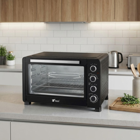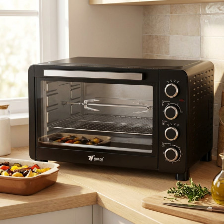 Forno elétrico de convecção e espeto giratório THULOS de 60 litros. Inclui vários acessórios. Seletor de temperatura de 6 posições e temporizador de 120 minutos. Porta com vidro duplo e puxador de aço inoxidável. Revestimento interno antiaderente. Luz interna. 6 elementos de aquecimento de aço inoxidável. Seletor de 4 funções. Temperatura ajustável: 100 °C~230 °C. Temporizador de 60 minutos. Potência: 2500 W. Cabo VDE de 0,9 metros. Dimensões: 645 * 462 * 397 mm. Voltagem: 220-240 V ~ 50/60 Hz. Em conformidade com A13 / CE / RoHS / EK1 / CLASSE 1. Acessórios: Bandeja esmaltada. Grade. Alça da bandeja. Gancho para espeto giratório. Alça para espeto giratório.