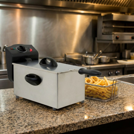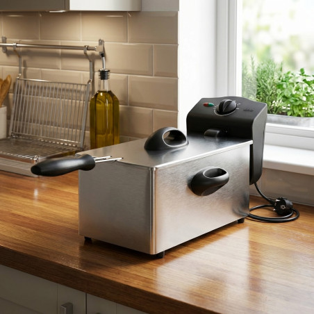 Fritadeira de 1500W em aço inoxidável polido, com interior e tampa também em aço inoxidável.